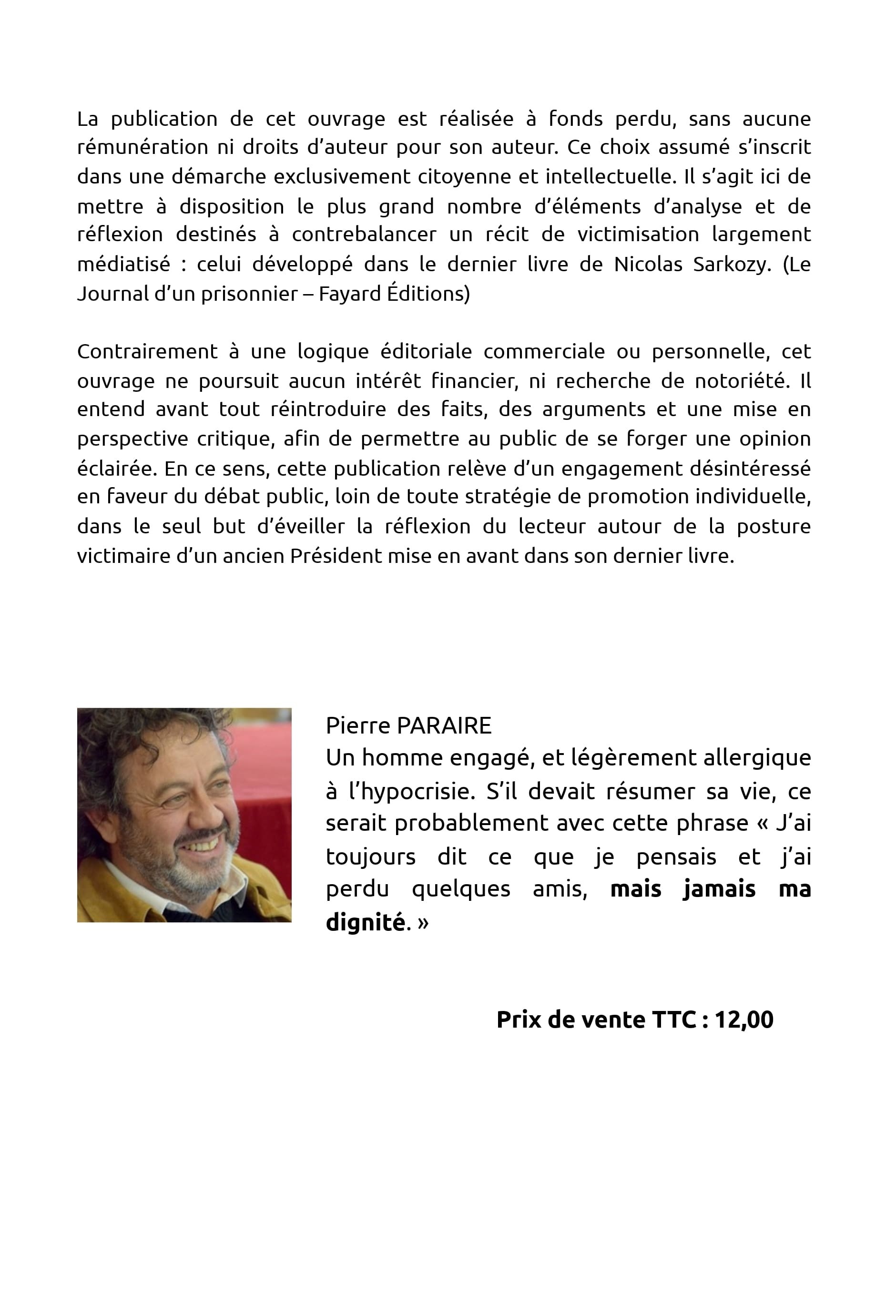 La publication de cet ouvrage est réalisée à fonds perdu, sans aucune rémunération ni droits d’auteur pour son auteur. Ce choix assumé s’inscrit dans une démarche exclusivement citoyenne et intellectuelle. Il s’agit ici de mettre à disposition le plus grand nombre d’éléments d’analyse et de réflexion destinés à contrebalancer un récit de victimisation largement médiatisé : celui développé dans le dernier livre de Nicolas Sarkozy. (Le Journal d’un prisonnier – Fayard Éditions)
