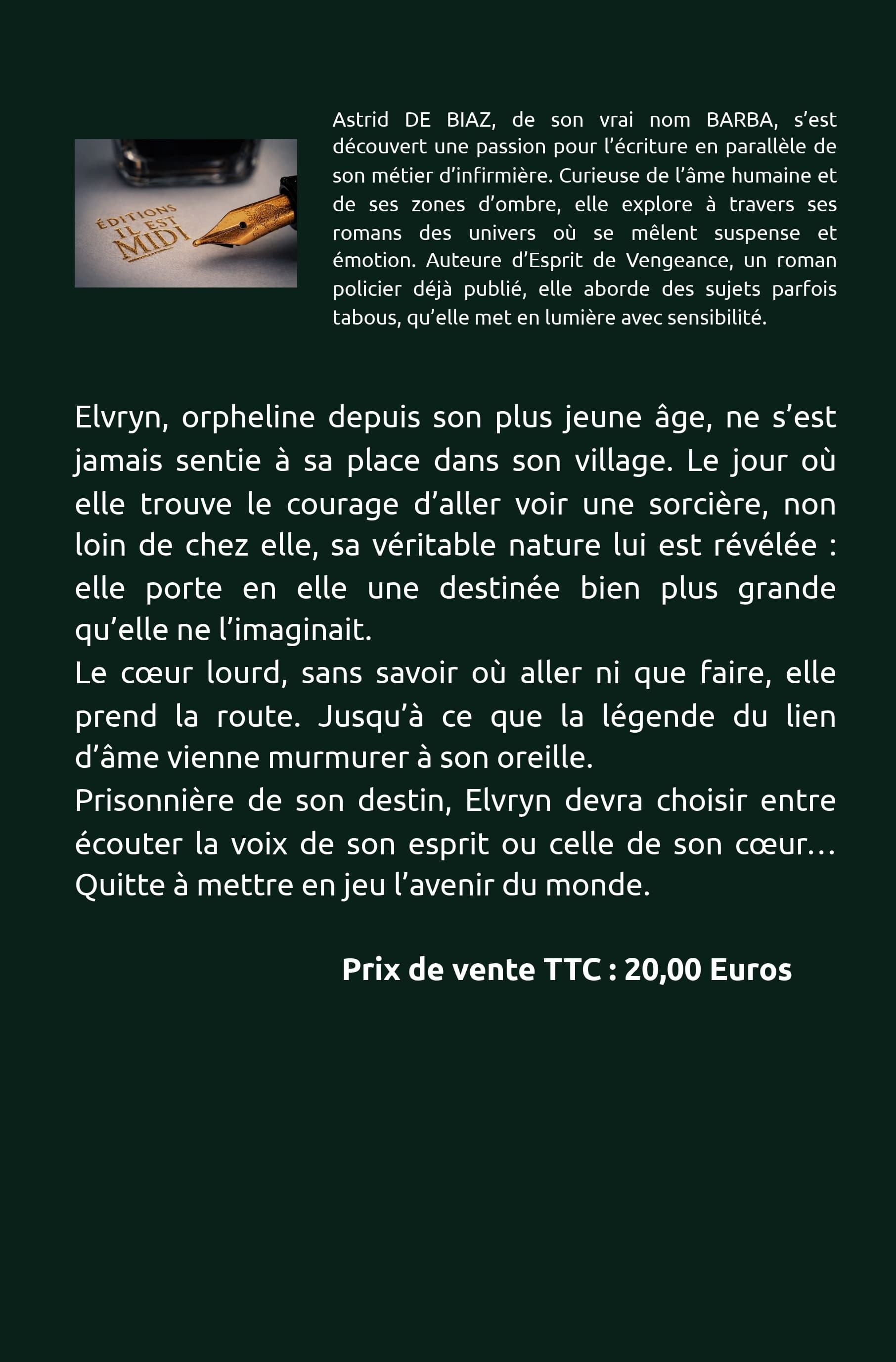 Elvryn, orpheline depuis son plus jeune âge, ne s’est jamais sentie à sa place dans son village. Le jour où elle trouve le courage d’aller voir une sorcière, non loin de chez elle, sa véritable nature lui est révélée : elle porte en elle une destinée bien plus grande qu’elle ne l’imaginait.