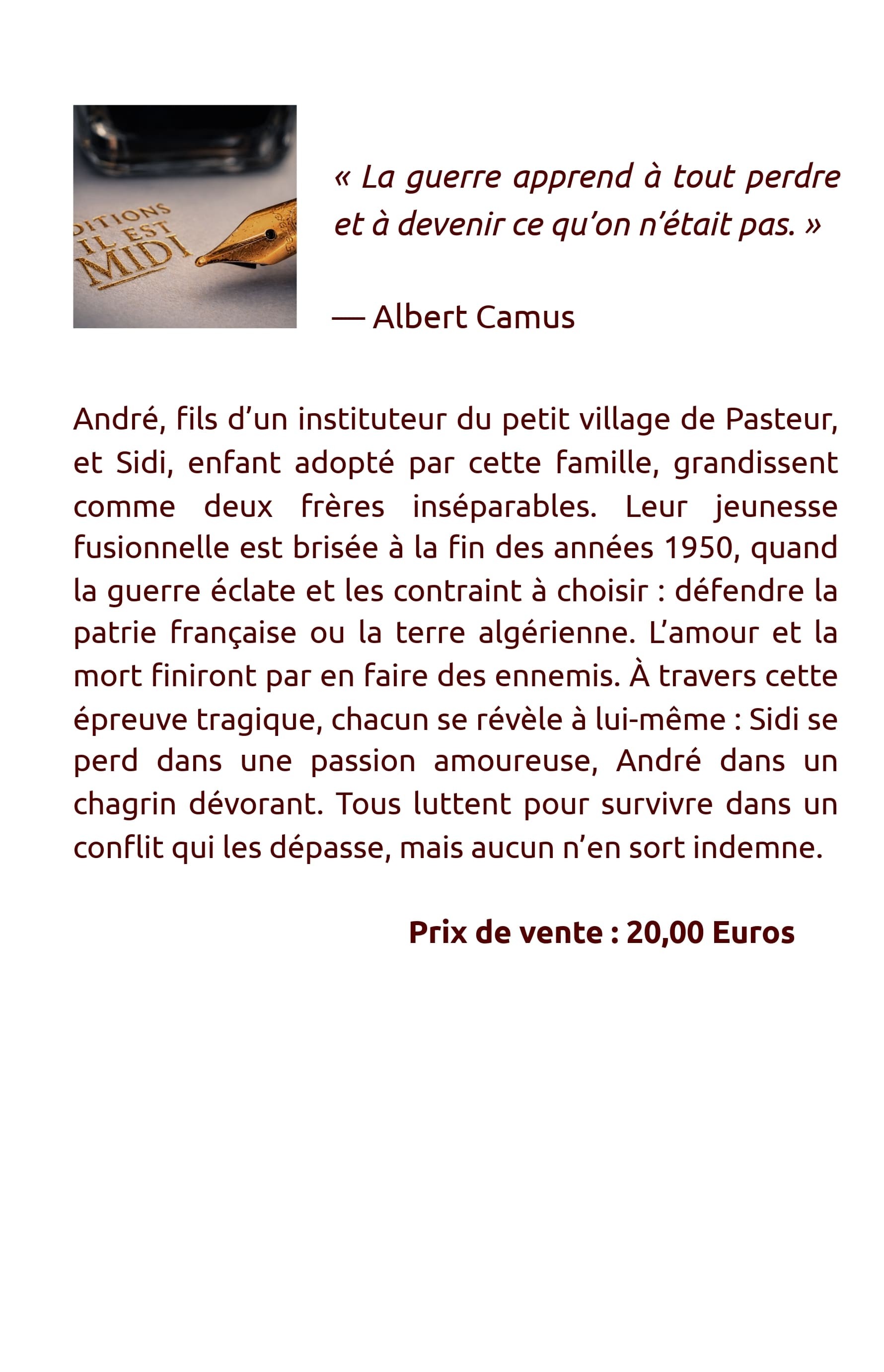 André, fils d’un instituteur du petit village de Pasteur en Algérie, et Sidi, enfant adopté par cette famille, grandissent comme deux frères inséparables. Leur jeunesse fusionnelle est brisée à la fin des années 1950, quand la guerre éclate et les contraint à choisir : défendre la patrie française ou la terre algérienne.